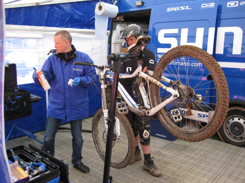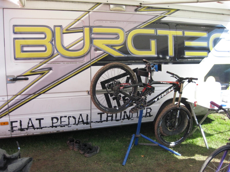 Shimano service team was kept busy as racers get things dialled in for race time, and crash damage patched up, J-Tech where also on hand with a mobile suspension tune up service. A walk around the pits, drop into Balfa Uk for a look at the FOEs on display and a hardtail in the back of the eze-up, photos might show how much detail is in the frame, very nice and another prototype landing next week !