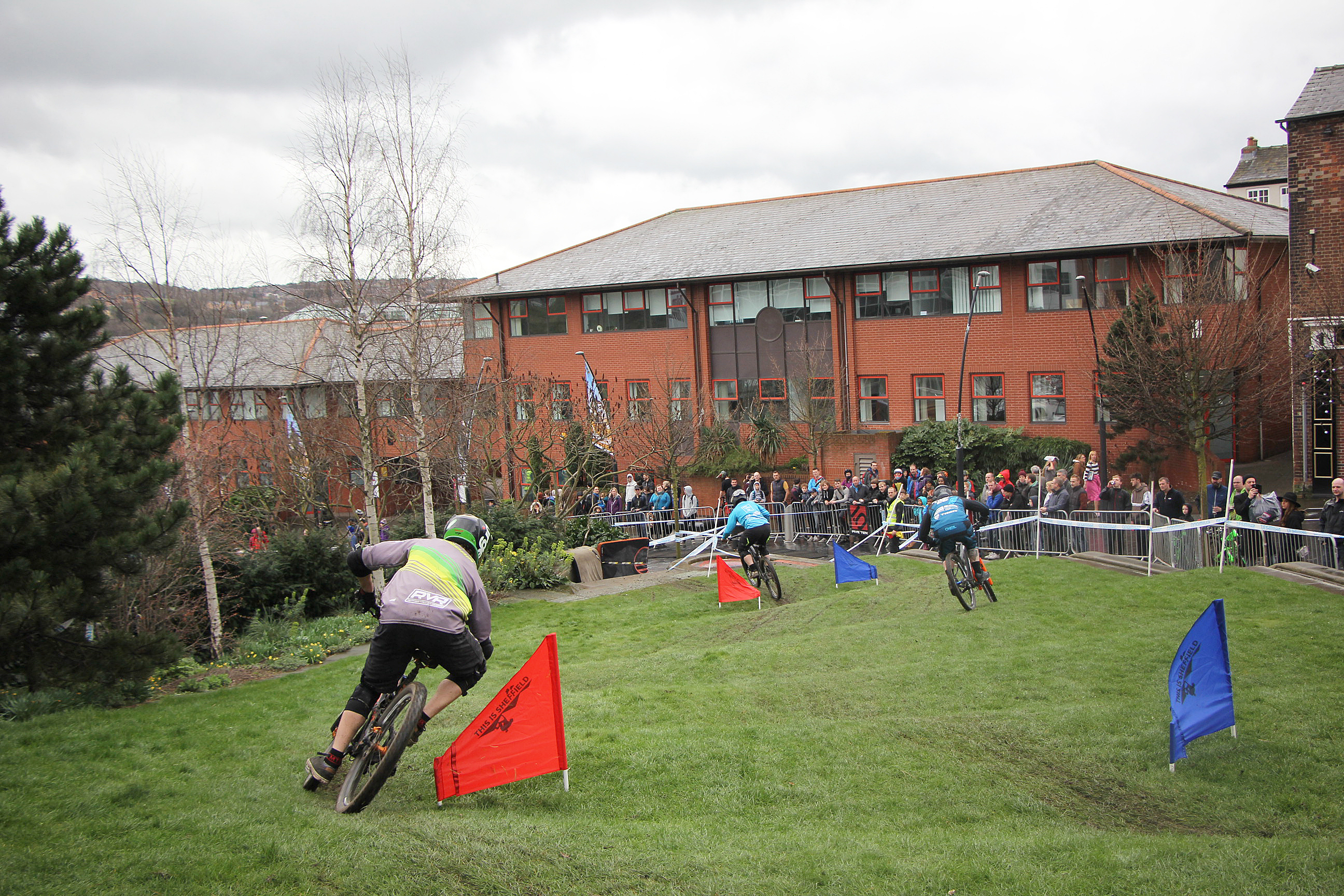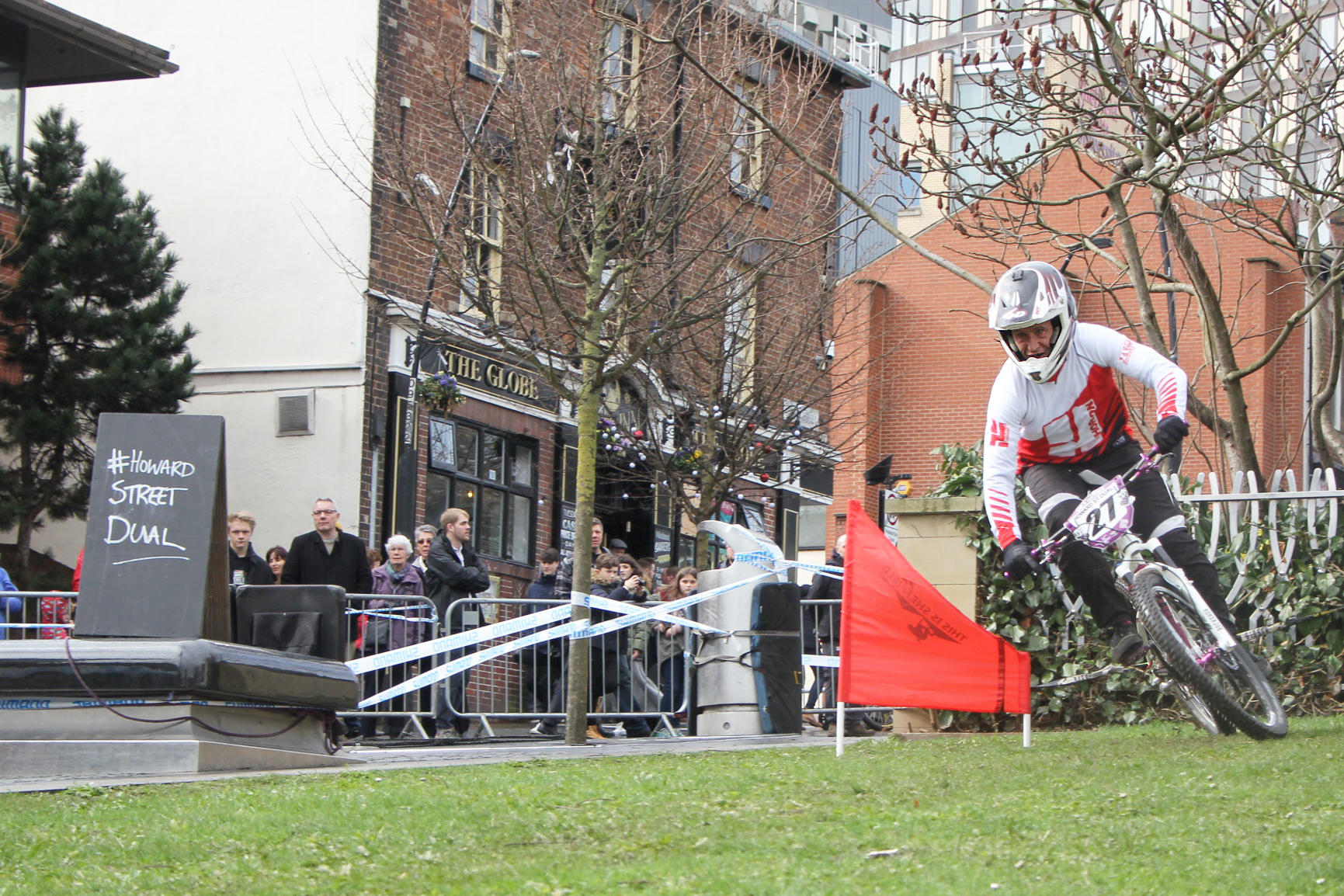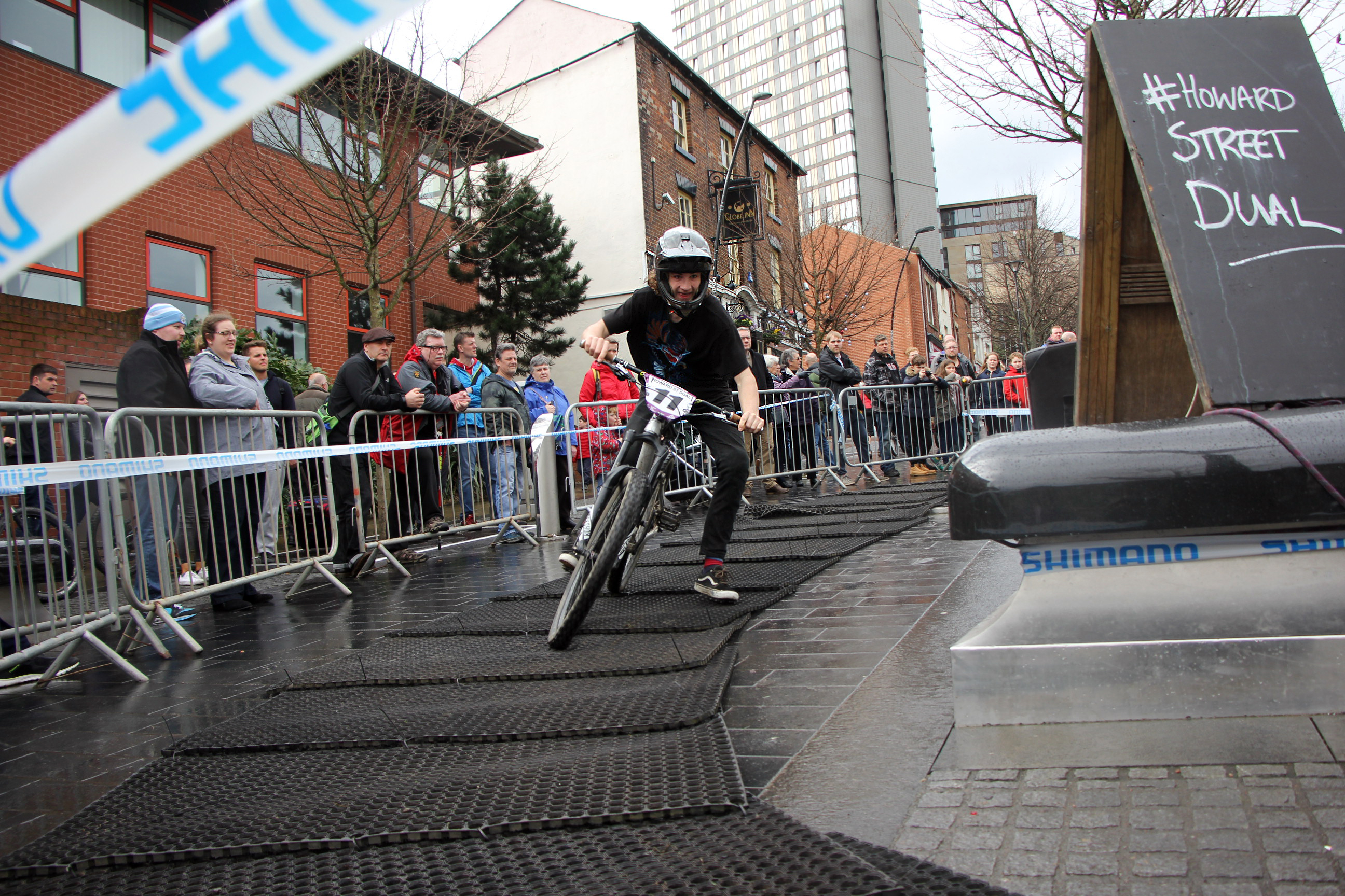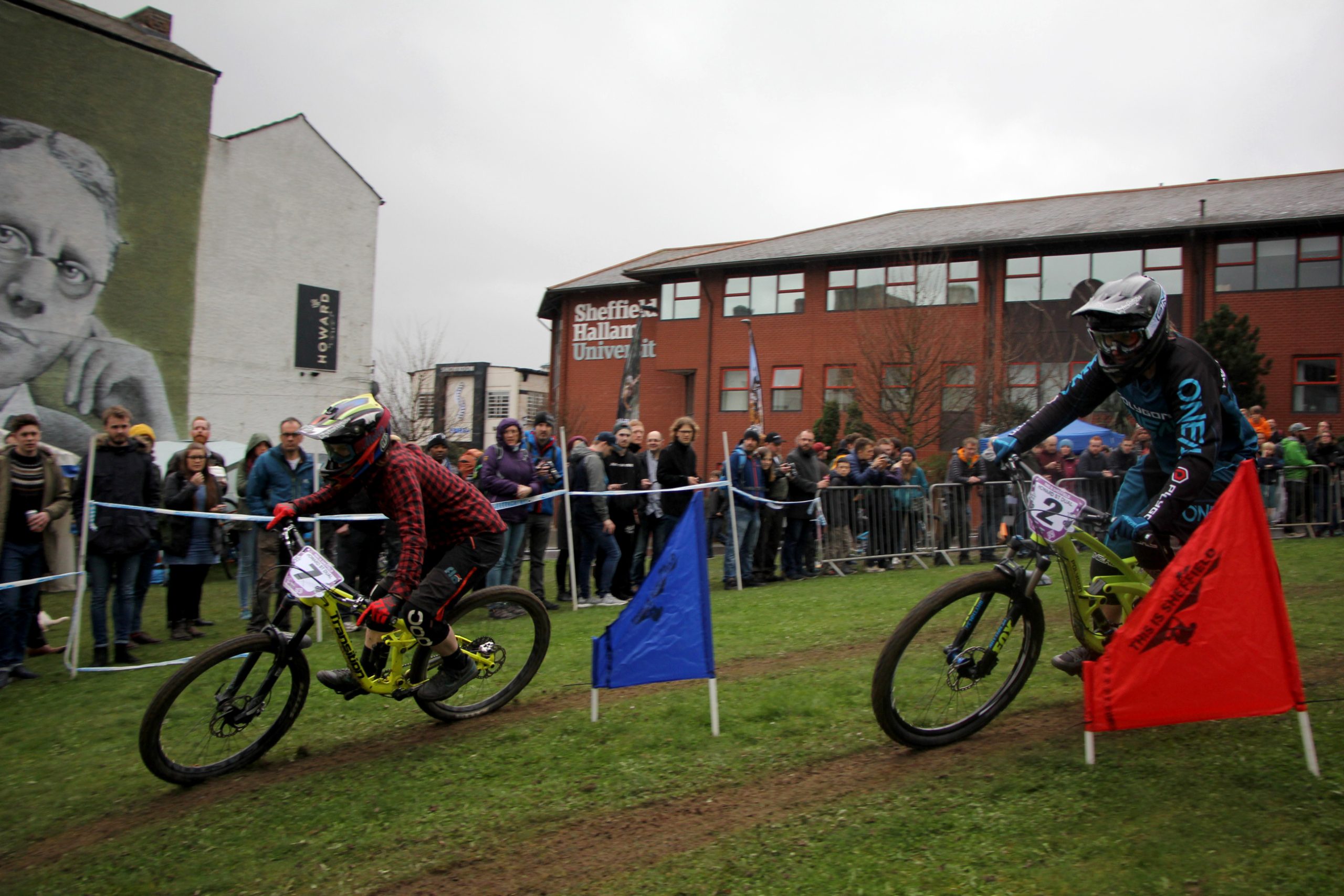 Despite this, there’s probably only one city in Britain that could host a dual slalom race that runs right through the centre and get away with it – Sheffield. With the backing of ‘Mayor’ Jon Dallow and as part of The Outdoor City Weekender, the ThisIsSheffield crew were allowed to close off Howard Street from Hallam University (big props to those guys for letting 40 rowdy mountain bikers rip through their grounds) down to the train station and hold what could be the world’s first Urban Dual Slalom race.