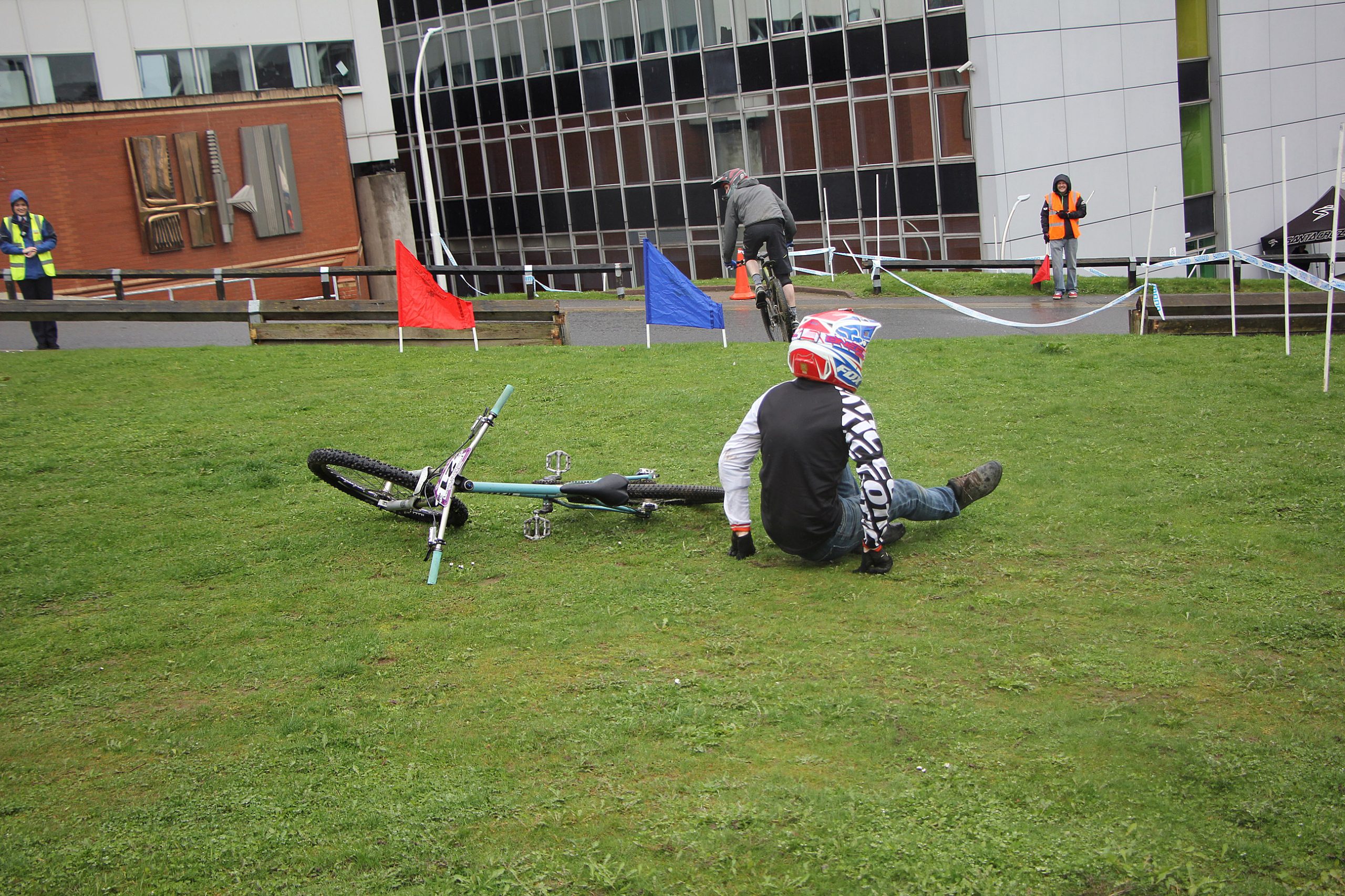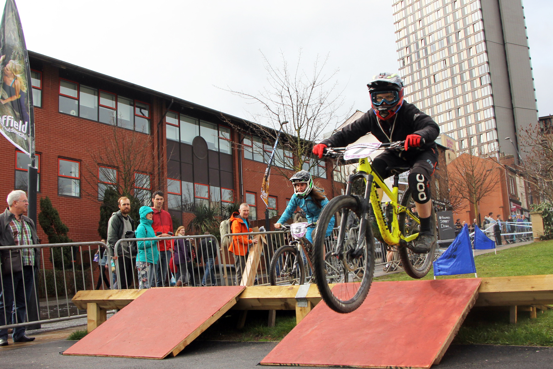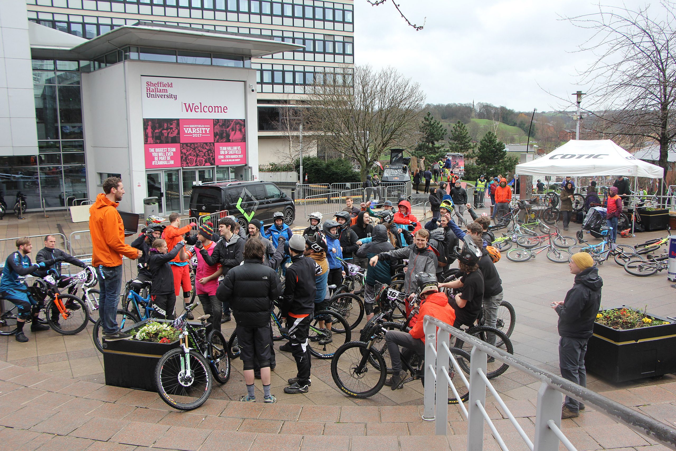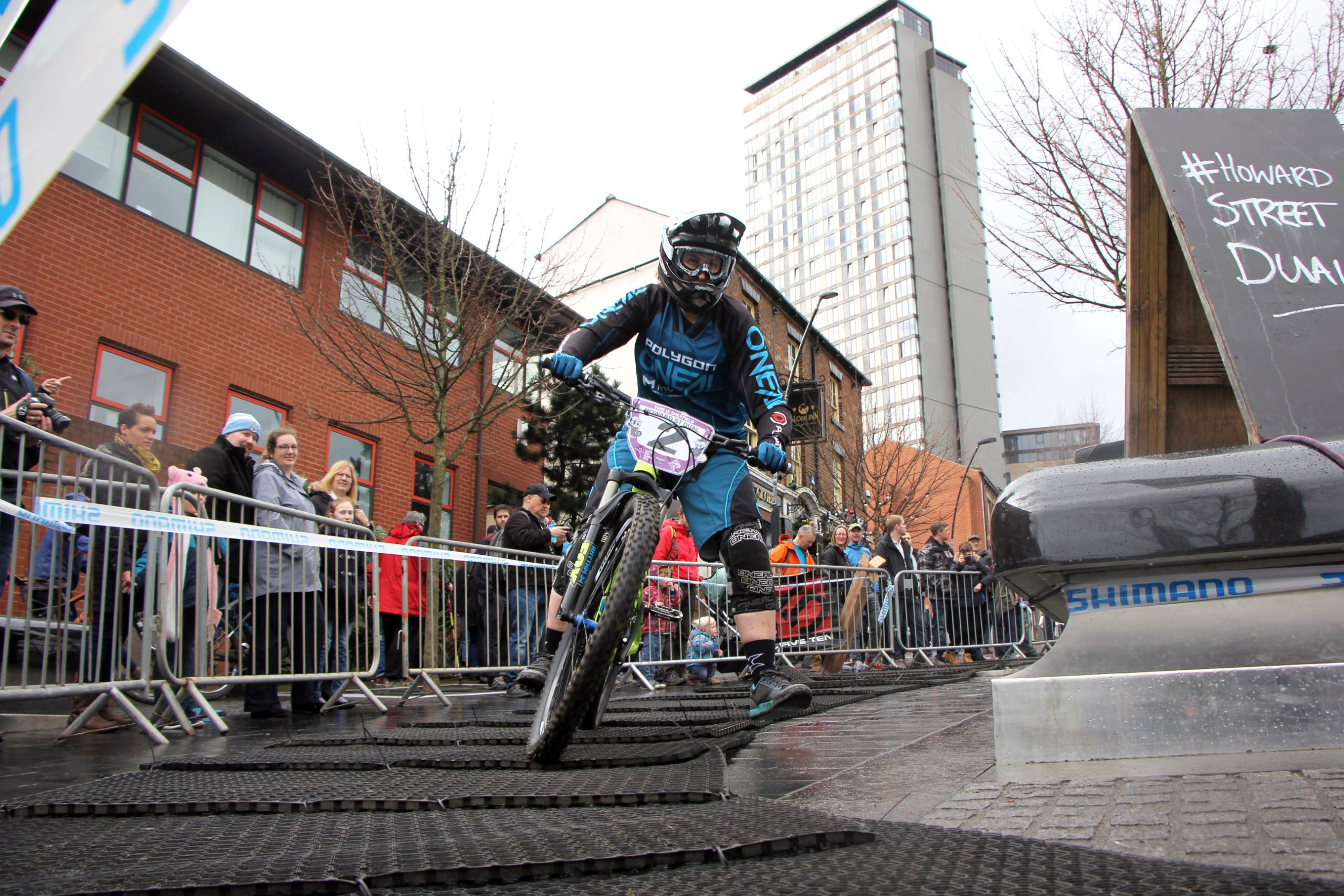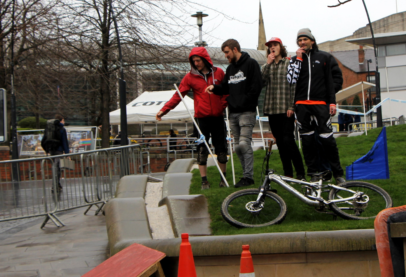 Despite this, there’s probably only one city in Britain that could host a dual slalom race that runs right through the centre and get away with it – Sheffield. With the backing of ‘Mayor’ Jon Dallow and as part of The Outdoor City Weekender, the ThisIsSheffield crew were allowed to close off Howard Street from Hallam University (big props to those guys for letting 40 rowdy mountain bikers rip through their grounds) down to the train station and hold what could be the world’s first Urban Dual Slalom race.