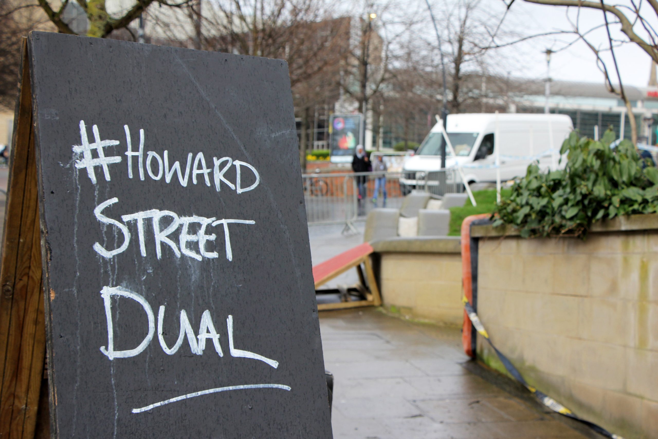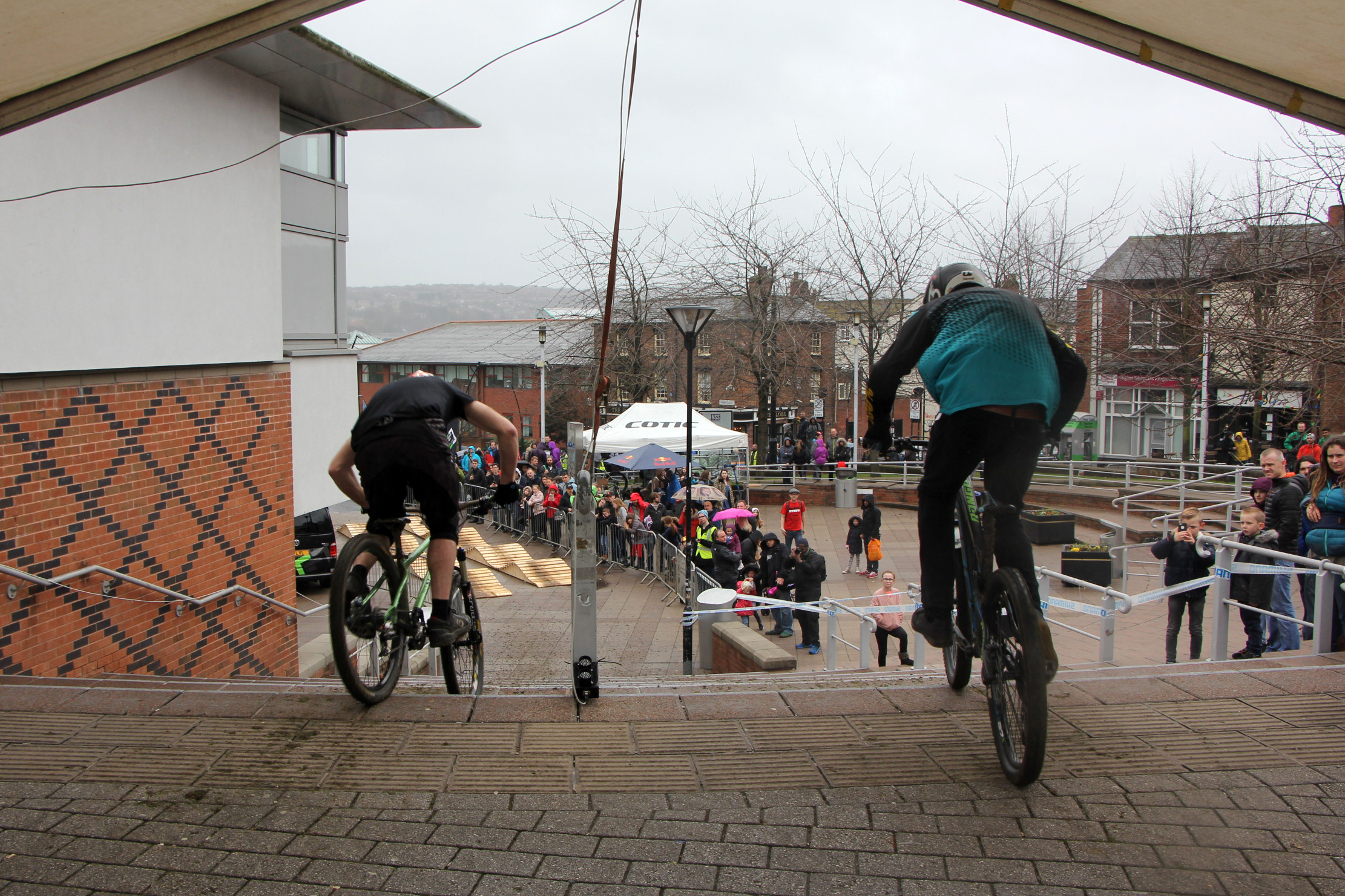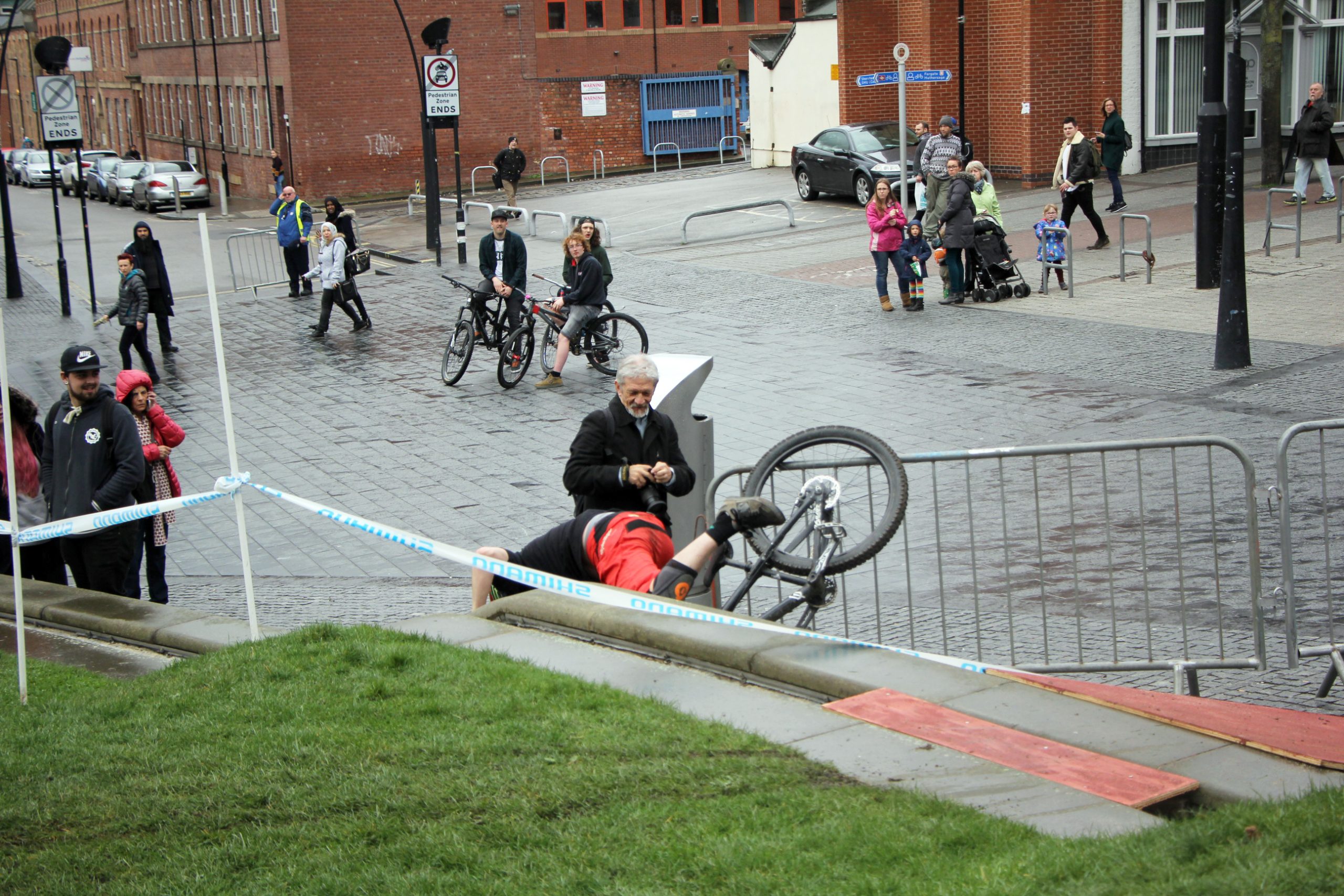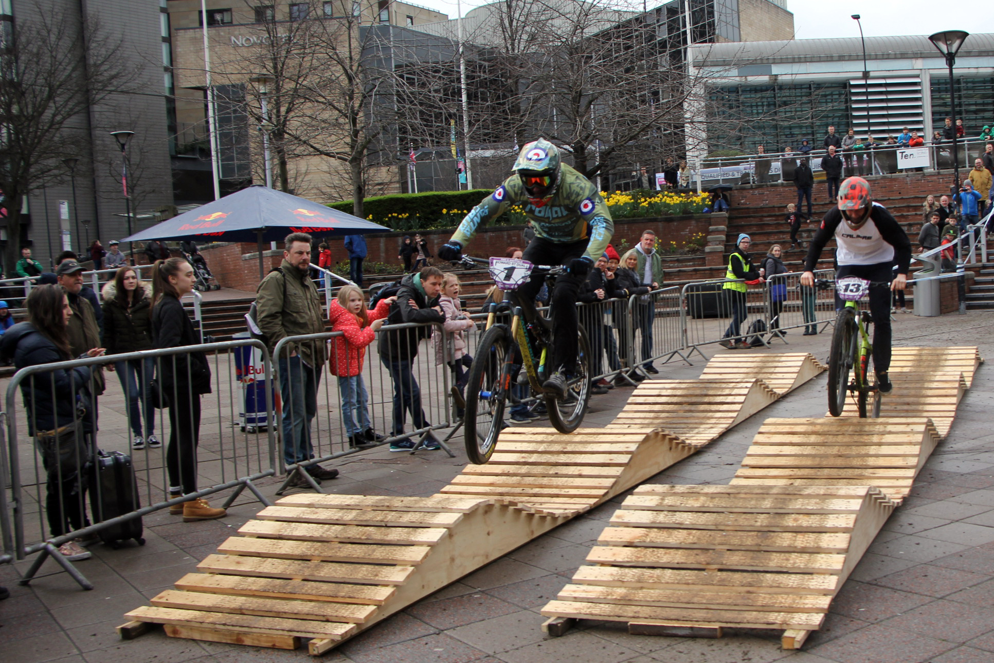 Despite this, there’s probably only one city in Britain that could host a dual slalom race that runs right through the centre and get away with it – Sheffield. With the backing of ‘Mayor’ Jon Dallow and as part of The Outdoor City Weekender, the ThisIsSheffield crew were allowed to close off Howard Street from Hallam University (big props to those guys for letting 40 rowdy mountain bikers rip through their grounds) down to the train station and hold what could be the world’s first Urban Dual Slalom race.