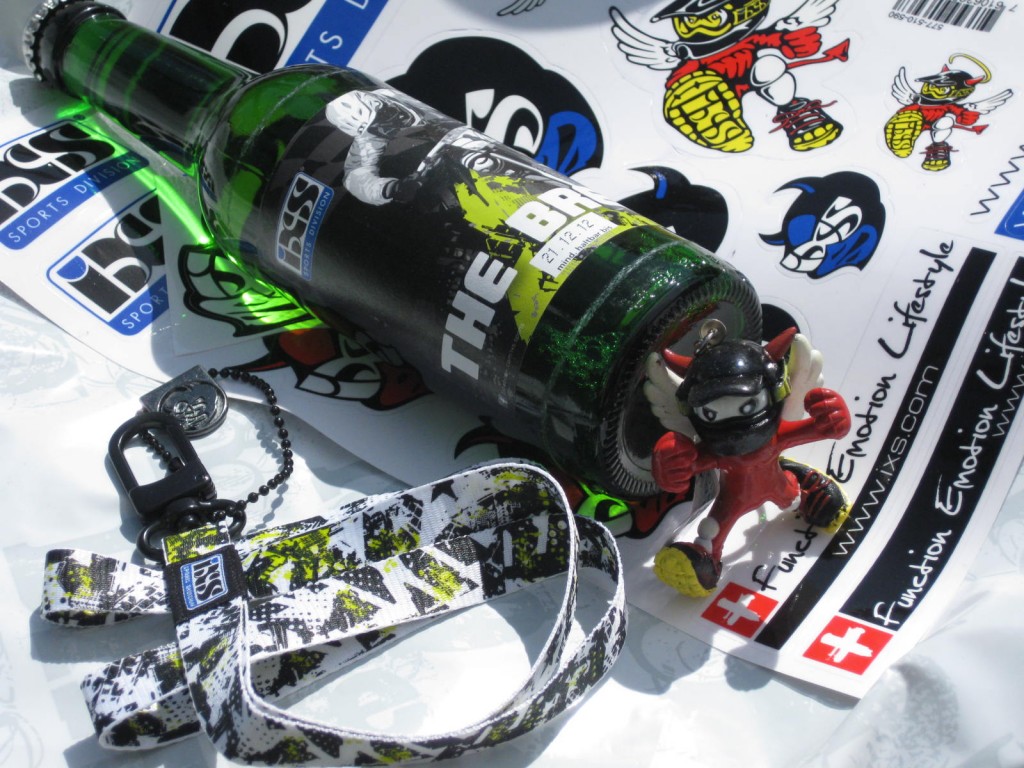 Freebies from IXS,  bottle of German beer,  drinking that next,  lanyard for keys and things, nice one too, stickers to cover up the damage to the monkeys paint,  and a weird little angel devil fella that’s getting zip-tied to the head-tube later.