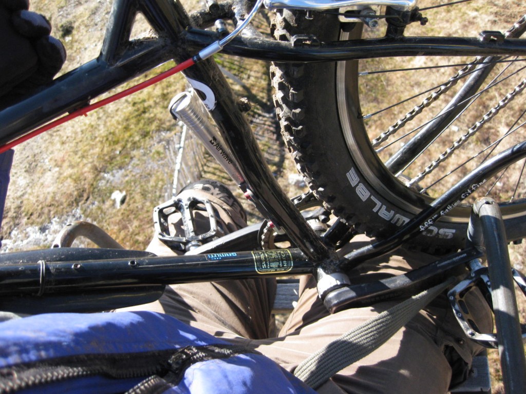 I had a good nights sleep curled up in the car with two sleeping bags, I was up about 7-ish and time to build up the rigid raider. As I pulled it from the car the bars didn’t swing free and smack me in the face like normal, they just stayed in position. Not good, I did some damage and the headset has seized, crack it free, spin the bars for a few minutes to get them moving freely then check everything else. The brakes are reset and cable pull adjusted, the pads are a rizla paper clear of the rims, levers fully out, sorted. The freewheel is still working, I blew out the grease with finish line chain lube, I only hope the cold dosen’t affect it today as I have two spare freewheels now but no 1/8″ chains, so stuck with what I have. Bike ready, fuel up time.