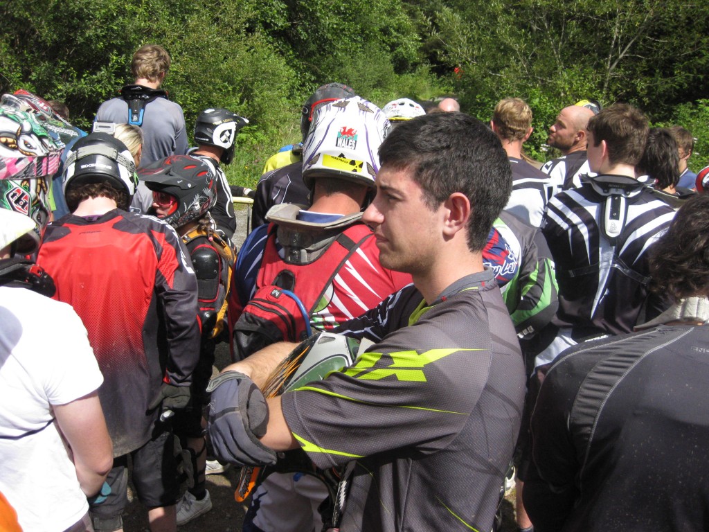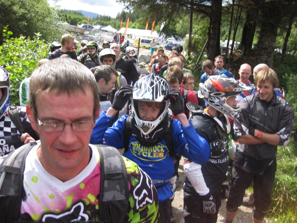 So part 2,  race time, 6 hours to try and hit 15 laps on a world cup track,  a heady mix of newbies, hardtails and world cup level riders duke it out, some want the win,  most want to survive.The view behind me on the start grid free for all melee. I just stuck my camera up in the air and grabbed a shot. Random story from racing, the fella with the glasses on, left front, bright top, a few runs in he rattled a lenses out of his glasses and was therefore having trouble seeing. He tried a few runs with no glasses then opted that one good eye was better. An indication of the right stuff for this event.Dear Dirt mag, please make some stickers so i can hand them out at races 🙂 everyone loves stickers.And the view in front of me,midges are in feeding frenzy this year, as we await the countdown and GOoooo run a 1/4 mile for your bike, no ones kicked it over, grab bike jump on, spin off, rear end the slower rider in front and stall….get going again, does this pro-pedal work ? sit and spin in full armour lovely, pass a fair few, spin not sprint, the leaders are gone. I am unsure to the length of ride uphill 2 miles ? i am now overheating and riding with the chap who loses a lenses from his glasses, so far so good, getting really hot so walk, i burnt myself out last year to the point of nearly being sick, take it easy this time, a few others spin past, but mid pack.