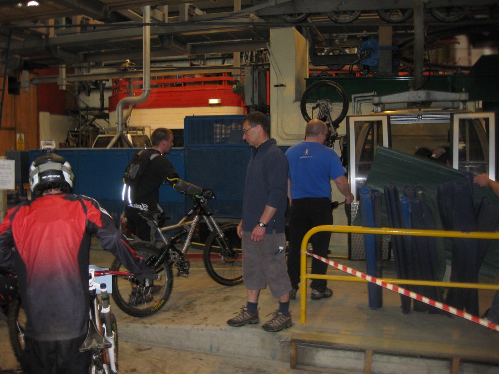Drop the saddle on the move, adjust helmet, goggles ready, reach the wall-ride, goggles on, drop in follow the rider in front down to the gondola.The start is designed to thin out the pack, after the first run you don’t have a queue for the gondola, rack the bikes sit down for a rest, drink,eat and ready yourself for racing. Some bikes have issues already.
