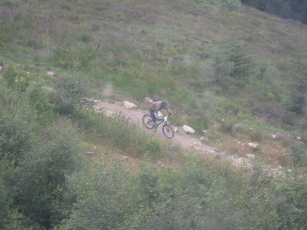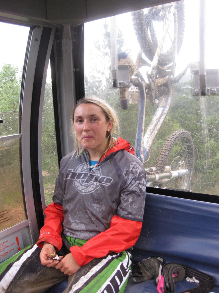 Run 5) 8.55.9 So far i am getting fairly clean runs, i see large groups coming down the top section in trains, little available overtaking, i pass broken people resting at the deer fence crossing and further up. The track is narrow up top, with no run out, you go off the edge of the track you crash simple as that, no where to go. The rear brake lever is now pulling in, and where is my magic carpet ride ? it’s smoother yes, but it’s harder work, i thought 8″ rotors would be awesome and i could sit down more, i stop for a rest in the pit, re check pads, lever pull seems fine. A few are milling about fixing flats having a little rest etc etc.Mike Sunter from Leyburn bikes, flat tyre wheel swap stock up go again (ta very much for the coffee i scrounged off you pre-race) I re spray with deep freeze and go again when it kicks in.Rachel Walker from Hope tech, my 6th, her 7th about halfway timewise, along with walkers with flats i see Jesse hitting up the motorway jumps….Rachel sees Rob Jarman (Hope as well) shouts out the gondola vent at him, he heard he was looking about, won’t be surprised if he claims a near crash moment because of it 🙂