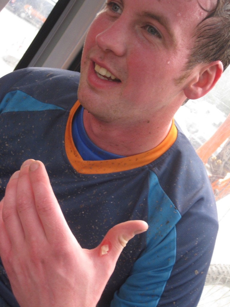 Run 2) 7.59.6 overcook the first jump 🙂 really rail it through the berms and remember why i never used the tyres, big gap between centre and side knobs, so slip and grip mid berm, go nuts down to where the off camber ramp is, yellow flags, slow right down, little Roslyn is trying to wrestle her bike off the ramp and rocks, get round go again, fine to the deer fence, scare myself silly down to the woods, really overcook the top of the motorway and fight to scrub speed and stay on the track, get over the first new jump and try another line down the wall.Run 3) 7.53.9 we spot Jesse and the rigid raider coming down below the deer fence crossing, he is a run in front at this point. I am getting the hang of the SX Trail, lack of trail feedback, it just picks up speed, it’s not a DH bike but nothing is slowing it down, i can feel the rear flex and the fork twang but it holds it’s line and goes where i point it, the tyres are sketchy in the fast top berms but no problems further down. We have on-off showers and wearing full length waterproof trousers paid off, the integrated zocchi mudguard is doing a Stella job too. On the way up i saw some track-side fixing flats, i pass others walking down flats or broken wheels, several are now chainless (thats normal) rear brake is not as sharp as it was and neck aches more.Run 4) 8.34.5 see jesse again trying to pass others through the rocks ha ha ha, you have not seen anything like this, nuts truly nuts. More walkers with broken rides. I am starting to have problems with speed as the rear brake is losing power and the bike just wants to go faster (sort of glad i didn’t have a faster DH bike now) muscle it down, pit stop, deep freeze my neck, check the rear brake pads, lever pull is alright i wonder if i have gone through the pads already or if it’s over heating as power drops further into the run i get.By this point i think 8+ have dropped out with medical or mechanical issues. By the entry list numbers 118 entered only 103 are listed in results.The mark of the Enduro’ist, bit early to lose finger skin, bleeding hands by double figure laps is common, spare gloves and plasters are handy….oh you thought this was an easy race did you !