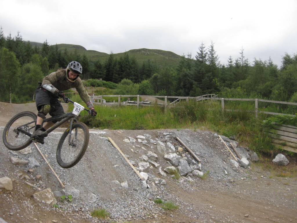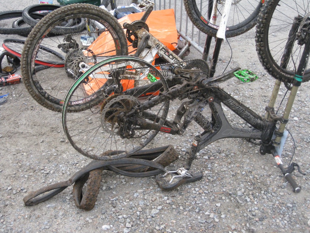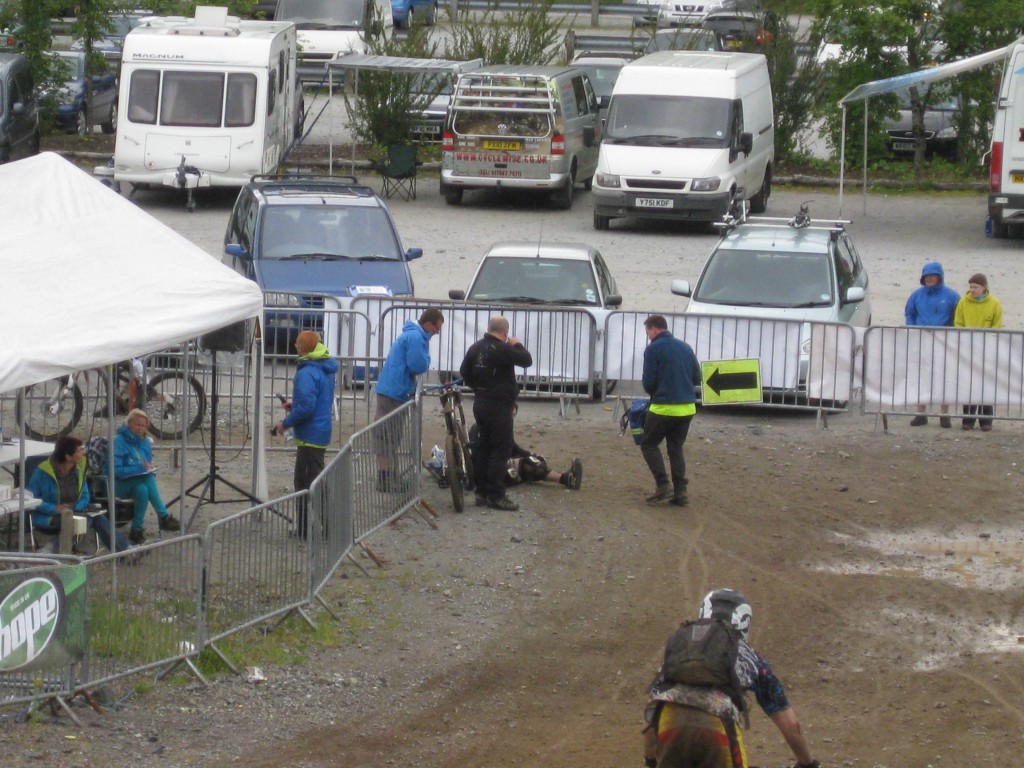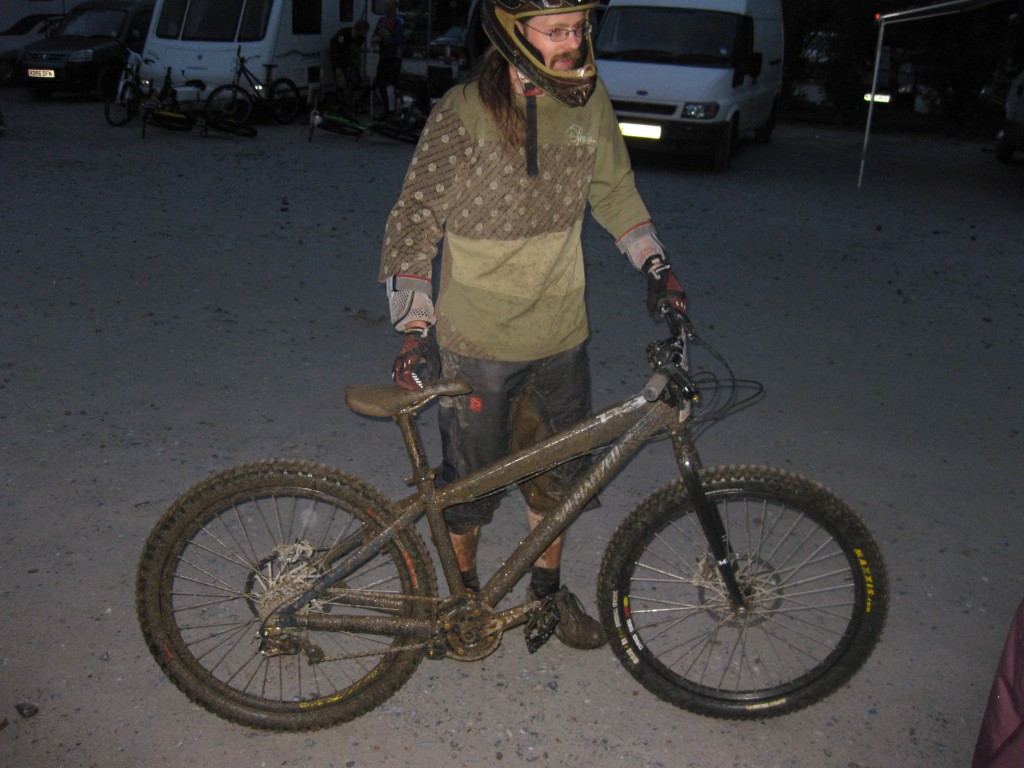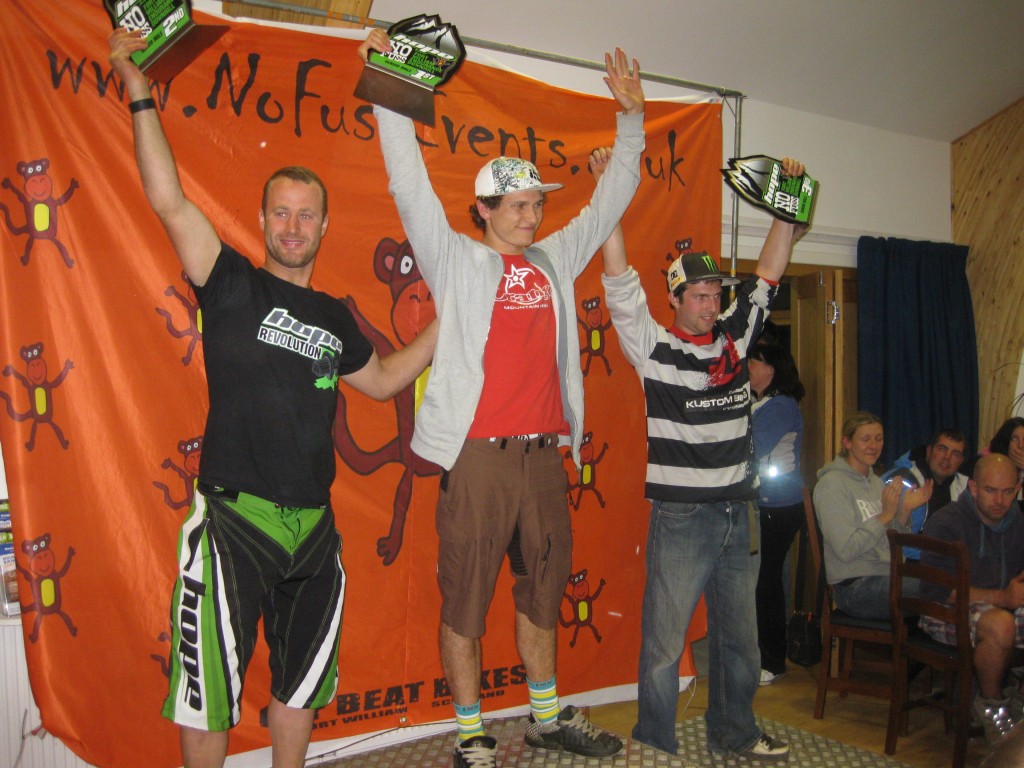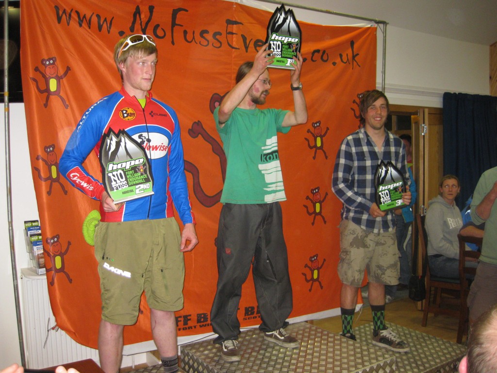I don’t retire as such, i play the press card ” going to take some photos” ahem may have another run in a bit if i fancy it, and spray up with deep freeze again. By now from 118 on list starters there are maybe 41 off track unable to continue. From looking at the results which only list 103 as finished thats 26 out, Ben Cathro a contender for the win (who i beat in 08) is also out on lap 7 with a time of 15.03 so the bike must have let go as Ben appears to have logged the fastest time of a 5.14.2 thats 10 seconds faster than the winners best lap time, i beat him before as the bike let go, so my 7 runs aren’t too shabby when you look at it that way, would a full on world cup factory bike last the distance ? doing 15 back to back 5.30 runtimes ?A crash on the finish line, couldn’t work out what happened, he rolled in then was on the floor, marshalls started shouting, dragged the bike clear and the medic dashed across. We saw Owain Jones at the end it was him. He lost it on the off camber ramp up top and whacked/twisted his knee, he managed to make it down but couldn’t stand up by then. Straight down the hospital, one x-ray later no obvious damage, nothing broken but a very swelling knee to take back to Wales, Owain binned it on lap 5, speedy healing as thats going to hurt a lot for a while.I love this photo, i was lucky to get it and Jesse styled it up a bit too, on the final jumps to the finish line on the rigid raider, pure quality riding and 40th overall, fastest lap 8.43.5The last 4 races i got a second wind, others get this too, not this year, by now James Shirly is heading up for his 15th run the race is over at that point, i have time to suit up and go up for an 8th lap before James get down, i decide thats a run too far and call it, maybe washing the bike before the queue begins is a good plan. Go for my bike WHICH IS NOT WHERE I LEFT IT ! fucking hell my bikes been nicked….i rush about looking and it’s been moved….don’t know who ? or why, thats too much excitement for one day now, i go find 50p and hose the bike off as i am sharing my little camper-car with it, get semi clean, changed and order food and await the final awards.The seniors and over all winner James Shirley, in 2nd on the left Rob Jarman, in 3rd on the right Ash Mullane. In overall standings 1st James, 2nd Rob, 3rd Alastair Maclennan, in 4th Ash and in 5th place Tom Gooch, also the only 5 riders to hit 15 laps.That should make sense, i took a snap of Frazers winners list, we have laps in the circle and time elapsed so James did 15laps in 5hours53mins52secs. Another nice touch was the Hardtail trophy, still not an official entry class, you let Frazer know your mental on arrival and they run a “specials” award which after the first race in 08 after me and Steve Larkin scared everyone they decided that was for us. You have to be special to have a go anyway as the whole concept is a bit out there, whats seen as the harshest world cup out there, which gets harder every year, quite different to any other DH race in the UK, can you do this on other world cup tracks ? Hardtailers (mentalists) 1st Jesse Wigman 13 laps on a rigid raider ! on the left and 2nd Joe Krejbich, on the right and 3rd James Simpson.