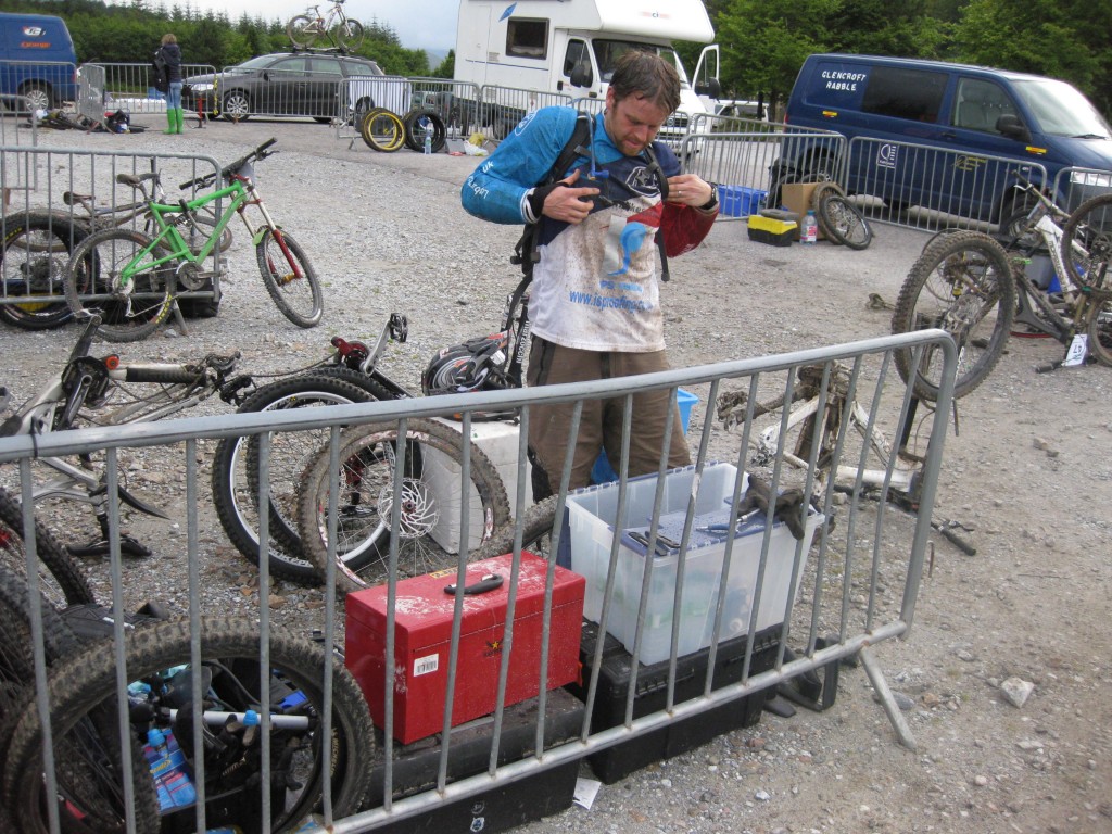 I skulk about in the pits and decide to have another run, then Ste rolls in the zocchi 55’s are semi locked, he reckons the cartridge has let go, i wash the fork and spray it in juice lube, it may not have much effect but might help, on seeing the fork juice lube Ste’s mate ask’s for a squirt so i drown his boxxers and shock in it, they both zip off for another go.