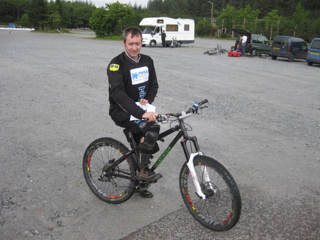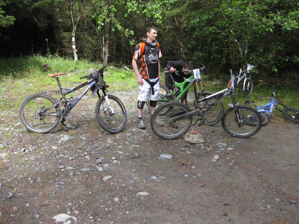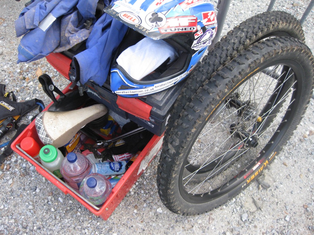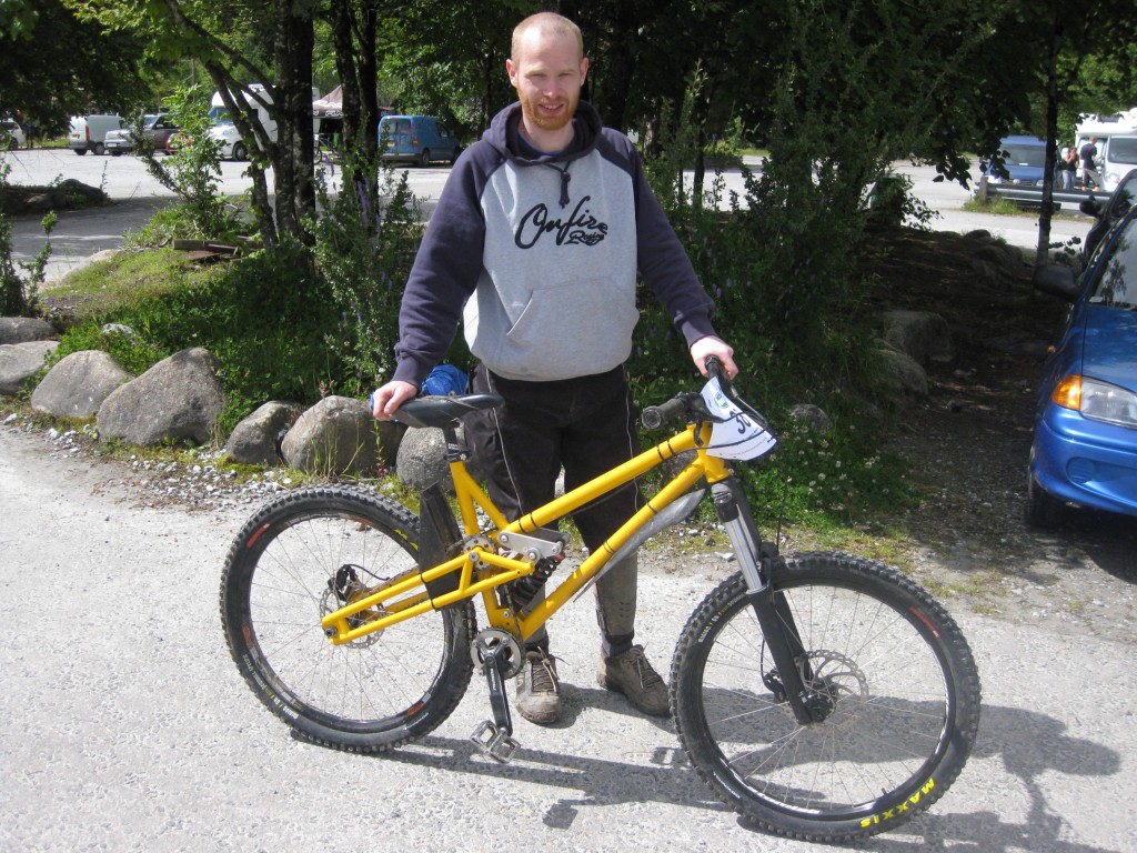 After doing the no-fuss Mac-avalanche down Glencoe on a rigid SS 29er (with v-brakes)  there where rumours about what i would actually turn up on for Fort William (i did try out the 29er from the big wall-ride to motorway),   i had already planned not to go HT this year due to being a bit battered and i was curious about what riding a squish-er down the fort would be like.  In my head….a magic carpet ride where i stay seated and just blat down the mountain laughing my face off at how easy it is.    I even got as far as trying it on with Orange for a loaner,  that got as far as them asking what i would like,   i replied “whatever you feel is best for the track”   would have been happy with a coil Alpine or 322,  that’s as far as things went, my contact Vaughan went off sick(broken collar bone) and the new PR man hadn’t started yet,  sort of fizzled out (turns out no bikes where free/available that weekend).   This may have been a good thing,  as i would have had a bike i couldn’t afford to buy anyway,  or pay for after i cartwheeled it through a rock garden.  Plan B,  in a box somewhere is most of a 2007 SX trail.The bulk of a bike was found, even had the original chunder tyres, at 1.4kgs each they should be fairly rock proof. I put out some feelers for some bits, Uncle Sam came up trumps and Thomson sent an aid package of a nice seat-post and a 50mm 4x stem, (gravity post is in proto stages, bars should be ready for public in September) somewhere out there is Gwins back up chain-device from Gamut, it hasn’t arrived yet so the old faith-full P30 was doing another tour of the fort (4th time now). The large SX frame was stripped down cleaned up, spring rate seemed about right, shock knobs worked, nothing had seized up, slack shuttle in place 66.5o HA, i found the original 11-34 cassette which will be handy for the ride uphill at the start. I have been using the brakes on a HT, i fit new rear pads, doing this cause’s the cylinder top cap to burp fluid(plastic caps)With raiding the HT and some mix and matching a race-able SX is ready 2 days before the race….if the gwinner arrives by 10am Friday it will be fitted. It dosen’t, pack the car and drive up Friday, sleep over in the Nevis range car-park and start the day with a fry up (caff opens at 9am) It rained most of the night and is on-off showers for the day. Build the bike up and go for a practice roll down to check out what rocks have been added and moved about since last year. Also, the track has seen action from lots of weekend warriors, a Halo BDS, an SDA and a World-cup, so as normal we get the rough end of the season’s use. Only some minor changes up top, slight change after the boardwalks, i am in auto pilot and hit the HT lines i am used to, there is a drop off with an off camber ramp to it’s right, i roll over that, and slide off it, bit greasy, the switchbacks are unchanged down to the deer fence crossing. From here to the woods seems rougher looser than before, the wall-ride to the big hip is unchanged. The new motorway, the first jump claims a few during the race, i have a loose stab at it and don’t like it, flat land, you have to carry some serious speed to clear it. The tables are fine, the off-beat wall had been tweaked early season, seemed to kick the back wheel up a touch, finish line is the same. Bike seems fine,brakes are fine, two minor scares from rear rebound, neck ache already. I save myself and go check out the rumour on FB that another HT’er is racing a Rigid Raider ! and bump into some interesting things around the car-park.Mark Amer and his home made bike, no IGH just single speed, we raced the dragons together back in 07, nice to see old faces. This is MK2 frame (Mk1 is here on dirt already, homemade bikes article a while back) he has been here a few days and already had a practice day. We get onto home-building, BTR racing and i make sure he chats to Ste from HT as he is about to make his own frame as well. Have to be confident in your welding to race here, Mark was.Ste Tomlinson, Orange Hit-man, first timer as well like Mark, and has also been about for a day or two to check out the track.Here we have Joe Krejbich, Dialled Alpine, seasoned enduro’ist now, next to him is first timer Gareth Chilton on a Ragley Bagger.James Simpson, Cotic Bfe and another i think first timer. Still one more hardtailer to find, i of course am getting lots of abuse and general piss taking for turning up on the squisher 🙂 however the cosmic karmic balance is being held in check by Jesse Wigman and his bike……yes really….i reckon i could do 3 maybe 5 tops on it, but i wouldn’t want to race it here.My SX is classed as old being a 07, i started racing an 04 P3 with no canti tabs, Jesse’s is pre-04, he thinks he might manage 10 runs, he will see how it goes. The joke is the last few races Jesse’s old Manitou Sherman’s seize up mid race and he is running rigid anyway. Deffo a one off, he didn’t have a fork available in time to race, so just whopped a rigid on…nuts !Alastair Maclennan junior, all prepped for the uphill sprint start with the non-fox-spesh-approved shock lockout mod, this was in full force again this year, get a good start, sprint a DH bike uphill.I did look at the SX, not really an easy way to lock it out so i had to rely on the pro-pedal knob working.Think that’s Roslyn Newman another first timer looking for a pit area spot to bag, i meet her again mid run in part 2.Pit box, everything you want must be in the pit area, so spare wheels booted to roll, i don’t have any spare 8″ brake rotors as i normally use a 6″rear 7″front Hope monoM4 system, but that won’t fit the 66fork. Track pump, spare tubes, tool box, while riding i have a small camel-back with a multi tool/mini pump/tube/lever, and the faith-full cans of Deep heat for the fingers and Deep Freeze for my neck, spare gloves and water and munchies for the next 6 hours. Spare parts choice is 