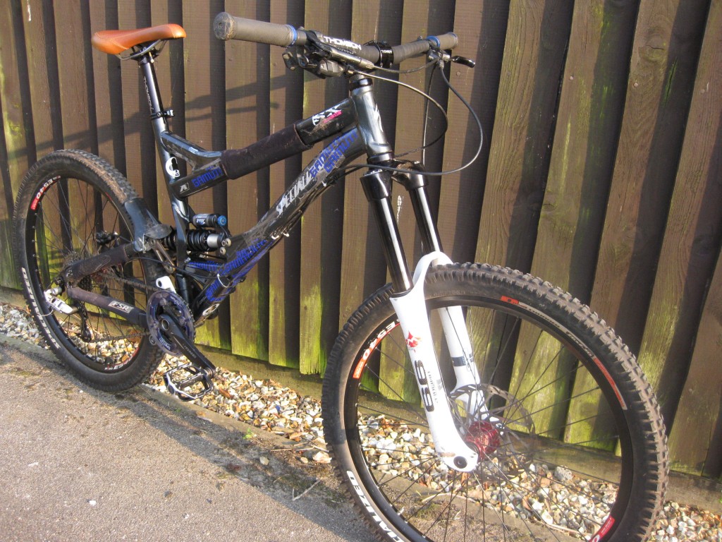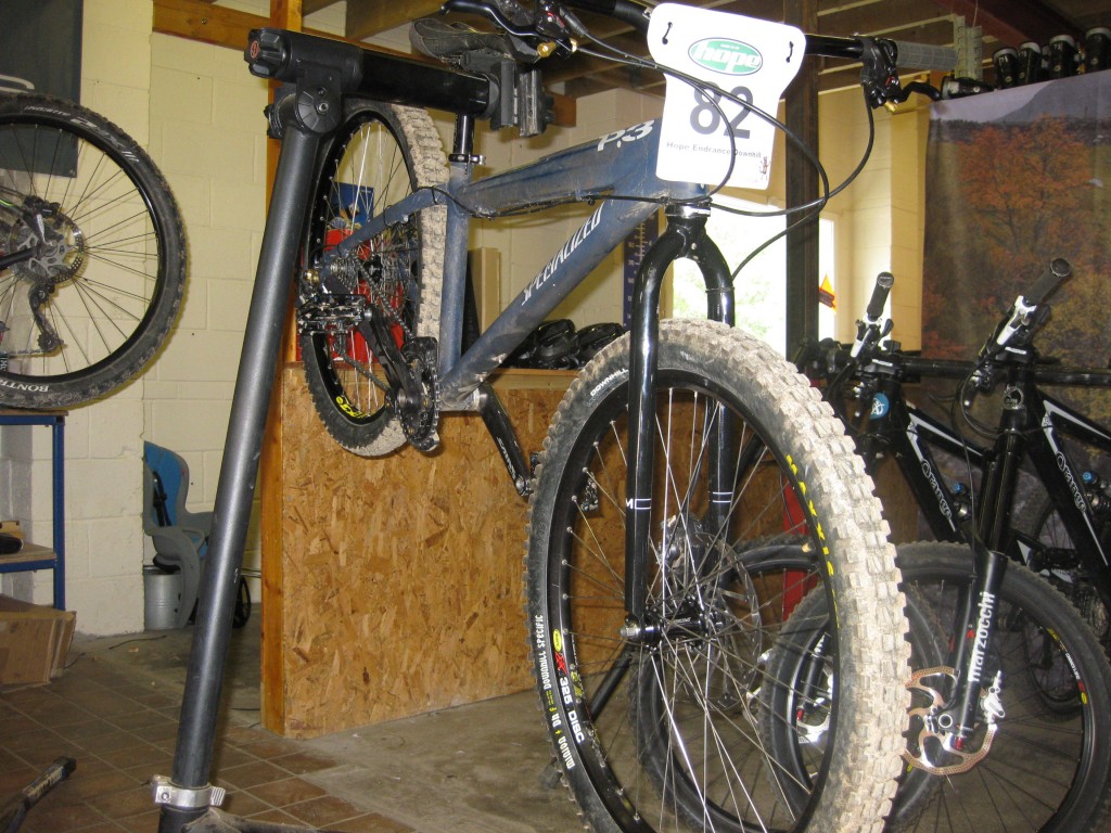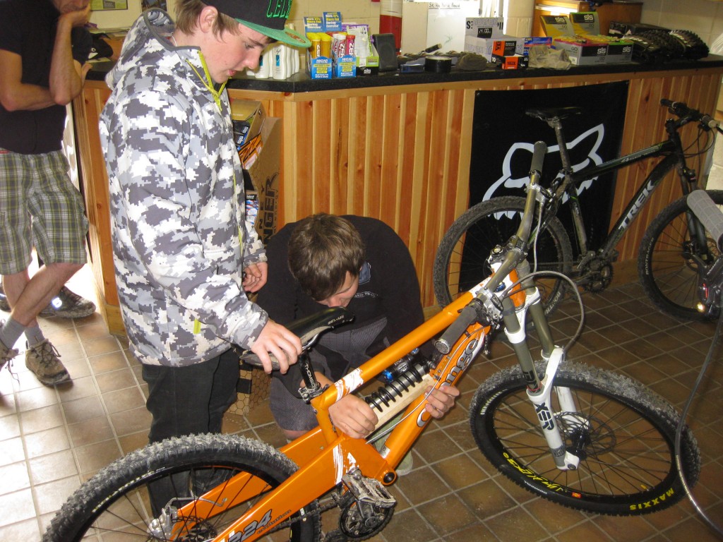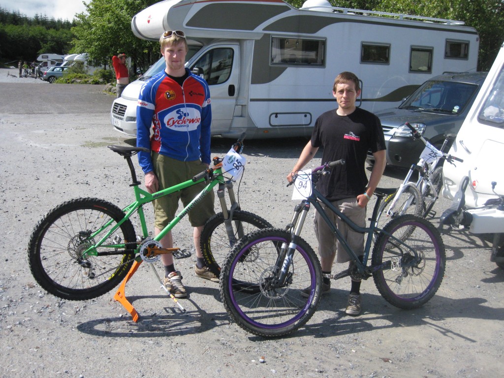 After doing the no-fuss Mac-avalanche down Glencoe on a rigid SS 29er (with v-brakes)  there where rumours about what i would actually turn up on for Fort William (i did try out the 29er from the big wall-ride to motorway),   i had already planned not to go HT this year due to being a bit battered and i was curious about what riding a squish-er down the fort would be like.  In my head….a magic carpet ride where i stay seated and just blat down the mountain laughing my face off at how easy it is.    I even got as far as trying it on with Orange for a loaner,  that got as far as them asking what i would like,   i replied “whatever you feel is best for the track”   would have been happy with a coil Alpine or 322,  that’s as far as things went, my contact Vaughan went off sick(broken collar bone) and the new PR man hadn’t started yet,  sort of fizzled out (turns out no bikes where free/available that weekend).   This may have been a good thing,  as i would have had a bike i couldn’t afford to buy anyway,  or pay for after i cartwheeled it through a rock garden.  Plan B,  in a box somewhere is most of a 2007 SX trail.The bulk of a bike was found, even had the original chunder tyres, at 1.4kgs each they should be fairly rock proof. I put out some feelers for some bits, Uncle Sam came up trumps and Thomson sent an aid package of a nice seat-post and a 50mm 4x stem, (gravity post is in proto stages, bars should be ready for public in September) somewhere out there is Gwins back up chain-device from Gamut, it hasn’t arrived yet so the old faith-full P30 was doing another tour of the fort (4th time now). The large SX frame was stripped down cleaned up, spring rate seemed about right, shock knobs worked, nothing had seized up, slack shuttle in place 66.5o HA, i found the original 11-34 cassette which will be handy for the ride uphill at the start. I have been using the brakes on a HT, i fit new rear pads, doing this cause’s the cylinder top cap to burp fluid(plastic caps)With raiding the HT and some mix and matching a race-able SX is ready 2 days before the race….if the gwinner arrives by 10am Friday it will be fitted. It dosen’t, pack the car and drive up Friday, sleep over in the Nevis range car-park and start the day with a fry up (caff opens at 9am) It rained most of the night and is on-off showers for the day. Build the bike up and go for a practice roll down to check out what rocks have been added and moved about since last year. Also, the track has seen action from lots of weekend warriors, a Halo BDS, an SDA and a World-cup, so as normal we get the rough end of the season’s use. Only some minor changes up top, slight change after the boardwalks, i am in auto pilot and hit the HT lines i am used to, there is a drop off with an off camber ramp to it’s right, i roll over that, and slide off it, bit greasy, the switchbacks are unchanged down to the deer fence crossing. From here to the woods seems rougher looser than before, the wall-ride to the big hip is unchanged. The new motorway, the first jump claims a few during the race, i have a loose stab at it and don’t like it, flat land, you have to carry some serious speed to clear it. The tables are fine, the off-beat wall had been tweaked early season, seemed to kick the back wheel up a touch, finish line is the same. Bike seems fine,brakes are fine, two minor scares from rear rebound, neck ache already. I save myself and go check out the rumour on FB that another HT’er is racing a Rigid Raider ! and bump into some interesting things around the car-park.Mark Amer and his home made bike, no IGH just single speed, we raced the dragons together back in 07, nice to see old faces. This is MK2 frame (Mk1 is here on dirt already, homemade bikes article a while back) he has been here a few days and already had a practice day. We get onto home-building, BTR racing and i make sure he chats to Ste from HT as he is about to make his own frame as well. Have to be confident in your welding to race here, Mark was.Ste Tomlinson, Orange Hit-man, first timer as well like Mark, and has also been about for a day or two to check out the track.Here we have Joe Krejbich, Dialled Alpine, seasoned enduro’ist now, next to him is first timer Gareth Chilton on a Ragley Bagger.James Simpson, Cotic Bfe and another i think first timer. Still one more hardtailer to find, i of course am getting lots of abuse and general piss taking for turning up on the squisher 🙂 however the cosmic karmic balance is being held in check by Jesse Wigman and his bike……yes really….i reckon i could do 3 maybe 5 tops on it, but i wouldn’t want to race it here.My SX is classed as old being a 07, i started racing an 04 P3 with no canti tabs, Jesse’s is pre-04, he thinks he might manage 10 runs, he will see how it goes. The joke is the last few races Jesse’s old Manitou Sherman’s seize up mid race and he is running rigid anyway. Deffo a one off, he didn’t have a fork available in time to race, so just whopped a rigid on…nuts !Alastair Maclennan junior, all prepped for the uphill sprint start with the non-fox-spesh-approved shock lockout mod, this was in full force again this year, get a good start, sprint a DH bike uphill.I did look at the SX, not really an easy way to lock it out so i had to rely on the pro-pedal knob working.Think that’s Roslyn Newman another first timer looking for a pit area spot to bag, i meet her again mid run in part 2.Pit box, everything you want must be in the pit area, so spare wheels booted to roll, i don’t have any spare 8″ brake rotors as i normally use a 6″rear 7″front Hope monoM4 system, but that won’t fit the 66fork. Track pump, spare tubes, tool box, while riding i have a small camel-back with a multi tool/mini pump/tube/lever, and the faith-full cans of Deep heat for the fingers and Deep Freeze for my neck, spare gloves and water and munchies for the next 6 hours. Spare parts choice is 