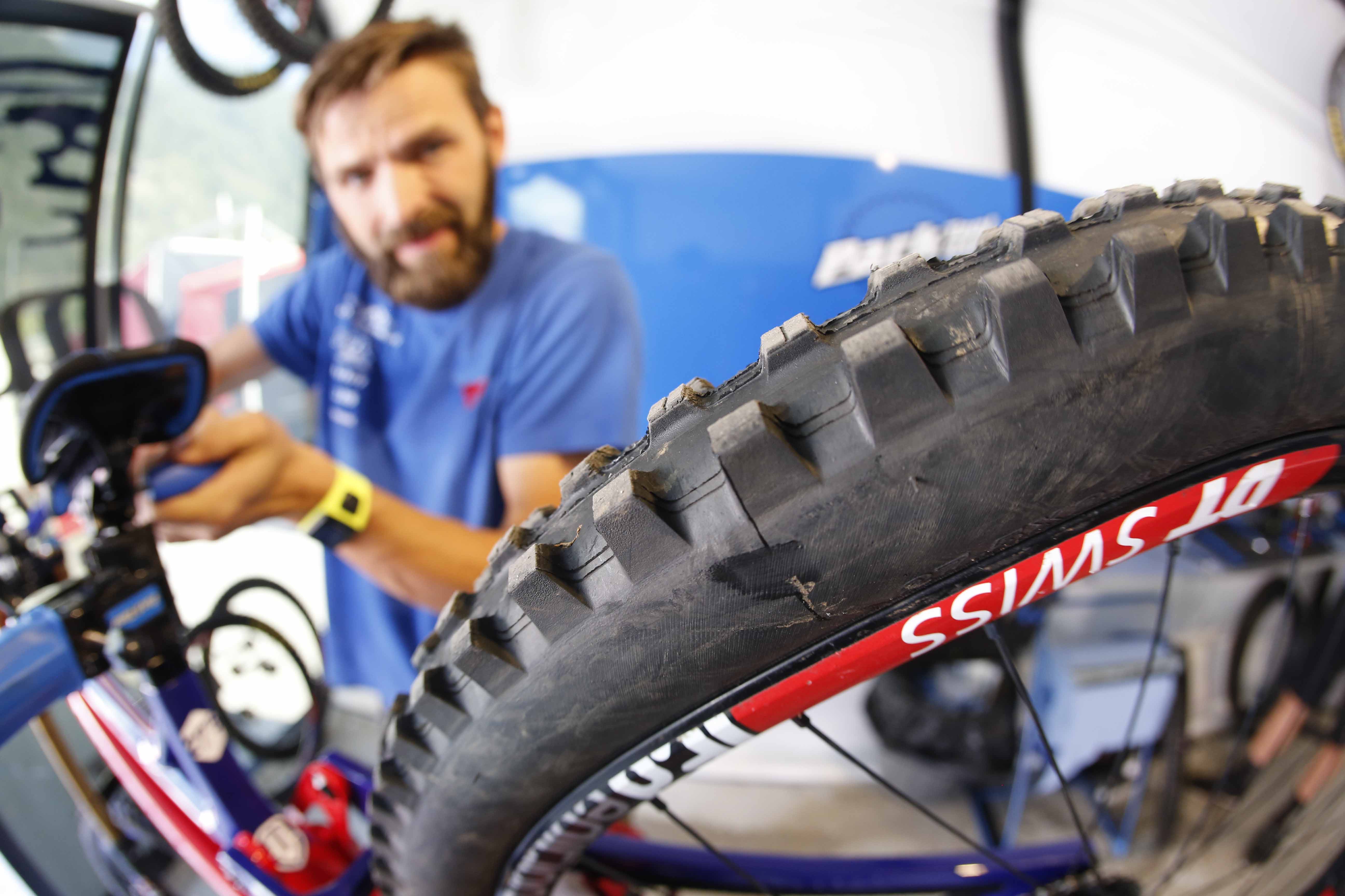 The track here at Val Di Sole is steep, technical and when ridden hard for several days becomes blown out with dust concealing rock and root in some of the most horrible places. Tyre choice appears to be leaning towards intermediate tyres, considered by many to be muds (although in reality a mx style stud pattern dry tyre) that aids braking and cornering with their slightly more aggressive side knobs and lack of ramped front edges.