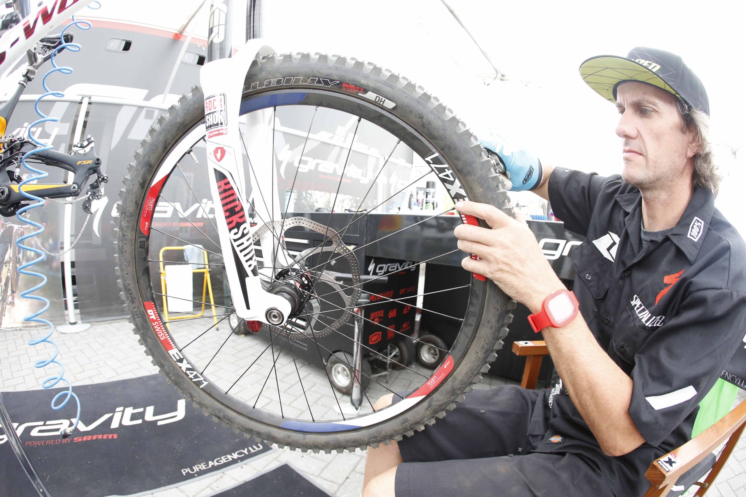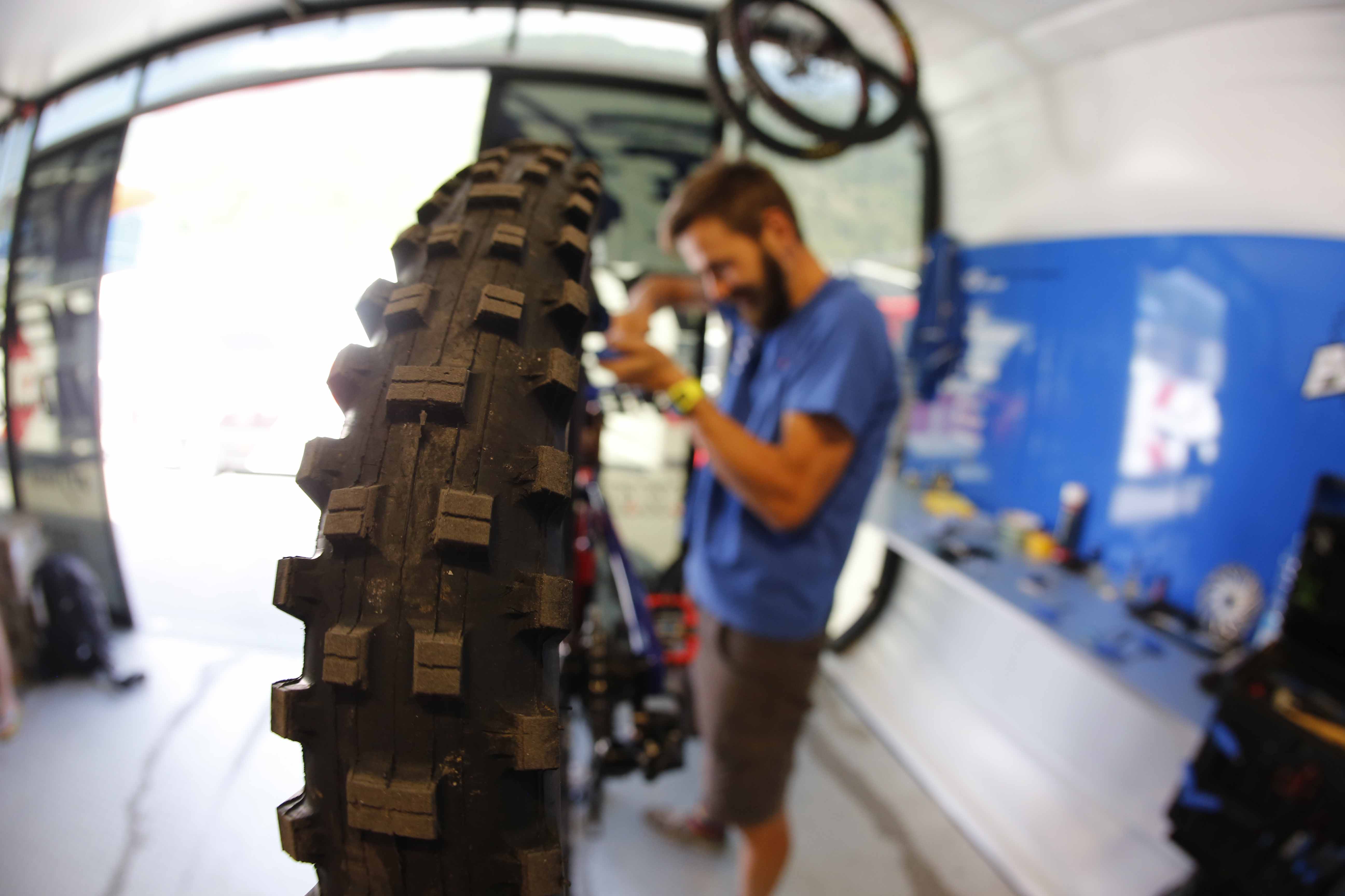 For some teams….in fact for several top teams tyre availability is limited hence they will be running unbranded rubber from other companies, the preferred choice being the Maxxis Shorty at present. For others such as Specialized the top racers Bruni and Brosnan have access to Butcher dry in 2.35 and 2.5, Hillbilly intermediate and Storm wet weather. Both Brosnan and Bruni are in fact trying cut down versions of both the Storm and Hillbilly.