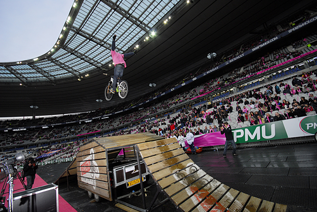 Stade Français VS Bayonne is a french TOP 14 premier league rugby match where we had the chance to admire a spectacular MTB Dirt show in the “Stade de France” in Paris. For the main french sport event, Five Solutions with the famous WRT Family were invited to propose to the 70,000 supporters an awesome Dirtjump show few minutes before the kick-off.