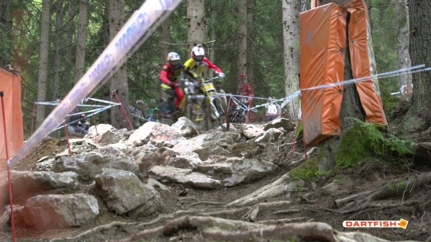 Arriving on the Friday morning we had a quick chat with the Dirt Norco Team and then headed up the gondola to get started. We spent Friday working our way down the course filming different sections and identifying which parts of the course would glean the most from being analysed. The Leogang course offers few line choices for the riders, so the gains are predominantly due to technique differences between the riders, especially in the top third of the course where it is about cornering technique and speed. The middle part of the course is about carrying and maintaining speed from the upper third along the flatter section and over the jumps, so hitting the jump transition smoothly and accelerating off the back end of the jumps is crucial here. The lower third of the course offered most from analysis with several parts having key differences in line choice