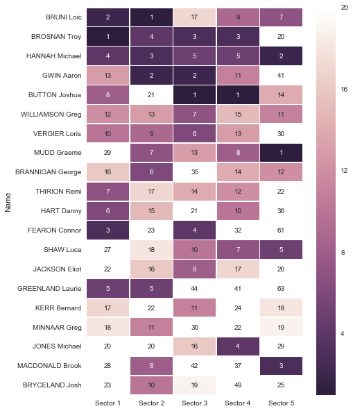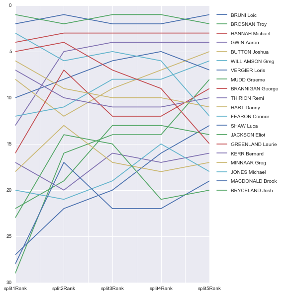 Finally, the postion tracker showing overall positions at each split shows the ding dong battle at the top, but most interestingly, it highlights the places gained and lost on that final pedal. Connor Fearon and Laurie Greenland lost out the most while Graeme Mudd’s charge from 14th to 8th stands and Josh Button’s sneak onto the podium in the last two sectors stand out in the up direction.