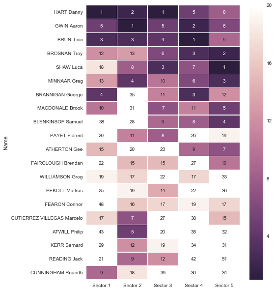 The difference between these top three and the rest is really noticeable in the heatmap. They were the only three riders who placed consistently in the top 10 at every sector. Others had one bad sector like Luca Shaw in sector 1 and Brook Macdonald and George Brannigan in sector 2.