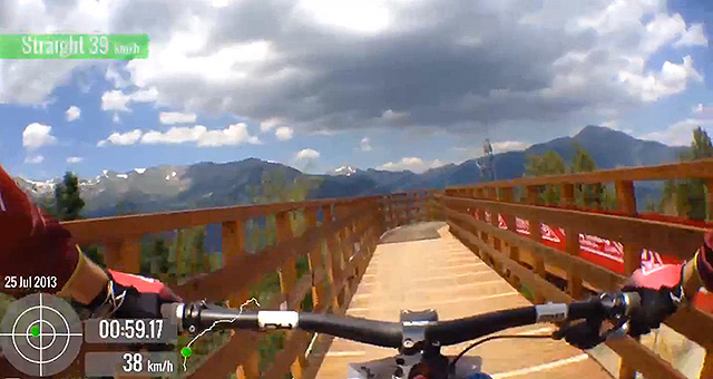 Greg Minnaar on the new Vallnord track during the first session of practice, complete with some fancy speed data...