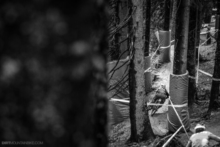Steve Peat chases Ratboy down a wet and slippery Leogang World Cup Finals track