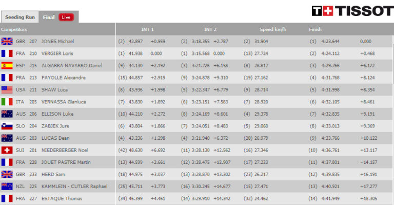 Mike Jones comes down the hill as the fastest Junior today, with a time of 4:32.529, almost 6 seconds faster than any other Junior.