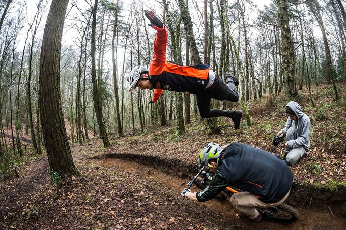 On Section 6 of A Slice of British Pie, it all kicked off. Put together Brendan Fairclough, joined by pan shot Friday king Olly Wilkins, and the most polite mountain biker ever, Jono Jones. Throw in a pick-up truck with a deafening MX-5 engine in it, one of the greasiest corners you’ve ever seen, and you’ve got a Surrey Hills hillbilly party like no other. Olly decided to hit a tree first run and then decided the action hero career route was for him, leaping over Jono Jones as you’ve seen on the poster!