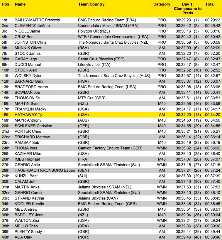 The first day is done and the table is topped by Francois Bailly Maitre in the Mens race and Ines Thoma for the Women. Jerome clearly isn’t hanging about and is only a few seconds back on Francois for second with Anita Gehrig and Anka Martin landing 2nd and 3rd in the Women’s race. Here’s the race video from Day 1 and the results are below too.