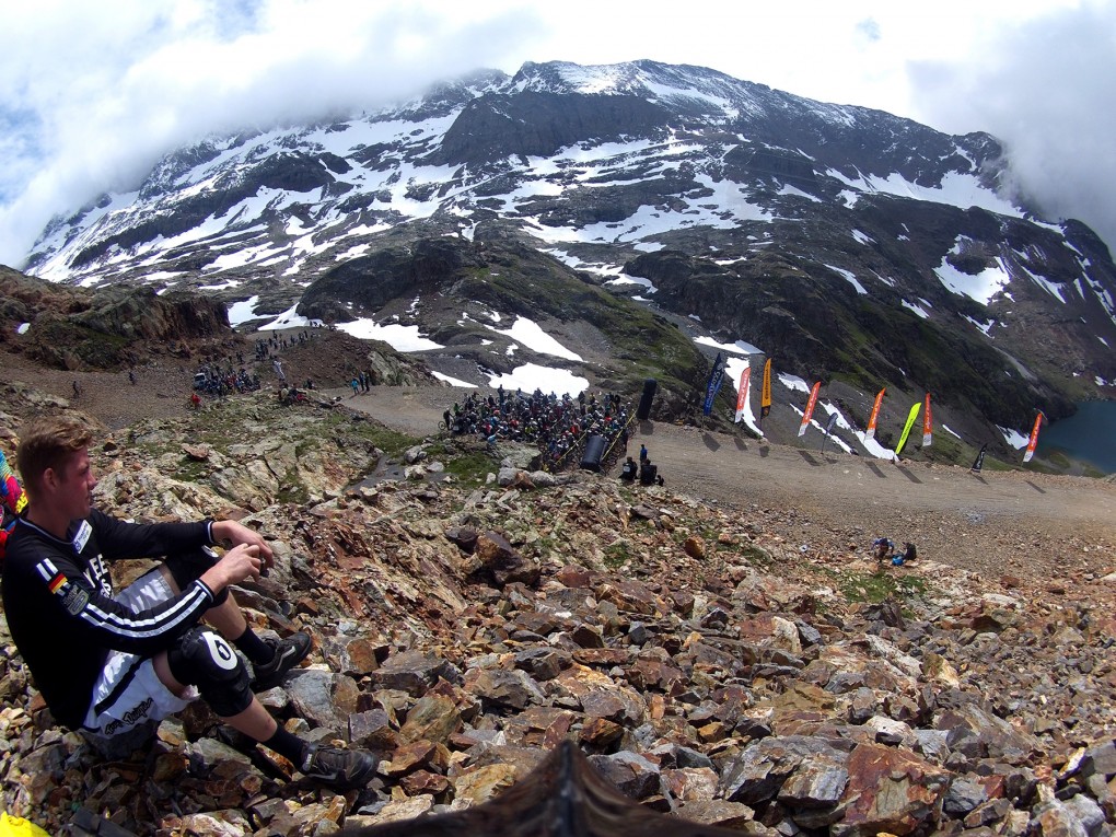 With the weather being poor and visibility being a safety issue for the organisers the qualifying race start line was brought down the mountain to start below the snow level (yes it had snowed lots at the top…in July!). The problem with this was it meant a narrow gravel track start line and then they decided to include a chicane 60m after the start meaning 20 riders were sprinting for a gap wide enough for two! Unfortunately I didn’t quite get there quick enough to get through unscathed and so people from my left came in and took a bunch of us down, me being caught in the middle of it. What seemed like an age later I had untangled my cables from another guys bike and got going again to find my brake lever badly out of position. A couple of bangs whilst pedalling and it was useable but strange. From here it was a case of overtaking as many riders as I could to try and salvage an A final position from the wreckage of my qualifying heat. I used my ION camera facing rearwards to try and capture the highlights of the race, but unfortunately in the scrum my camera got knocked and so the angle isn’t ideal but I still managed to capture parts of the race. Despite the awful start I finished in 12th position (the first 23 make the A final), so a mid-pack start for Sundays final means if I want a good result in the main race I will have a lot of overtaking to do early on!