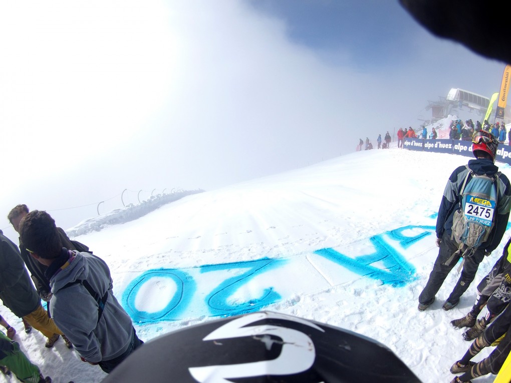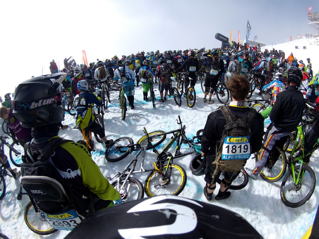 It wasn’t until Saturday evening that news broke that the main final on Sunday would actually start up on the top glacier at Pic Blanc, but an hour later than usual at 10am. At least we had an extra hour in bed! I was hoping for it not to stop raining on Saturday so that the mid wooded section would keep wet rather than start to dry as it was some of the worst conditions I have ever ridden in. The mud simply stopped wheels from going round and resulted in an exhausting push or walk with your bike if you lost momentum. In the end the ‘C’ final that runs after the ‘A’ one was diverted to miss this section and apparently finished just below Alpe D’Huez rather than Allemont at the valley floor, such were the crapness of conditions down there.