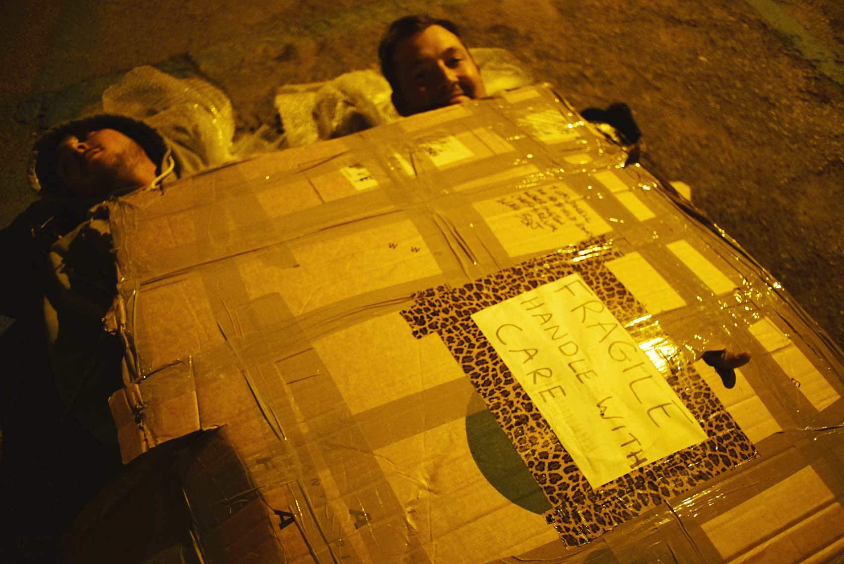 He persevered and proceeded to use my bike box as a bed to sleep in, and all the packaging as a make shift blanket. Ed then slotted in beside him to make the lowest budget double bed in history. Some old Italian man even kicked them in the night to see if they were dead or not!