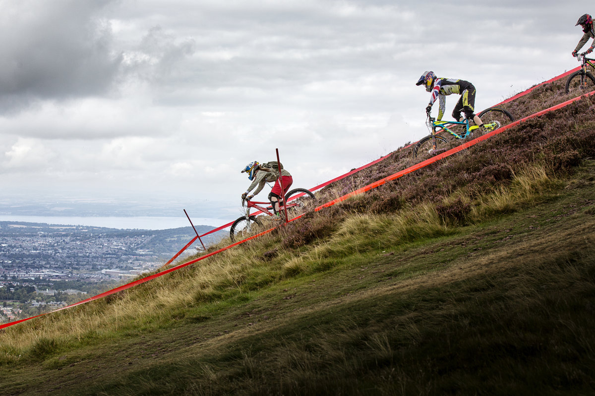 This is such a great idea. The Fox (Rachel Atherton) has to chase down the hounds (over 120 female racers) down a 3–4 minute track. The hounds get a head start and then fox overtakes. Thirty-five hounds (racers) manged to get to the bottom before they were overtaken. Love it.