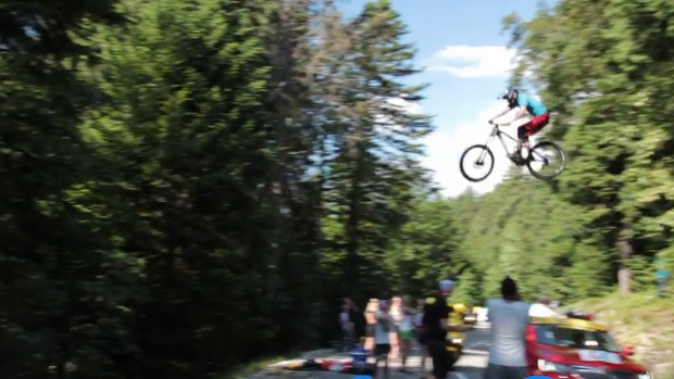Roman Marandet sends a jump high above one of the leading group of riders in the Tour de France!