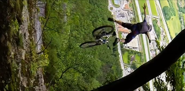Whaaat? We've seen this done on skis but this has to be a first base jump on a mountain bike...